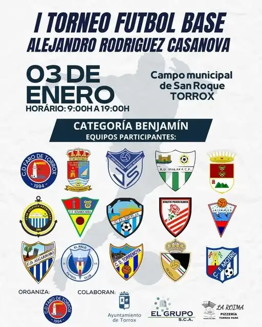 Por otro lado, el I Torneo de Fútbol Base “Alejandro Rodríguez Casanova” también se jugará mañana sábado, 3 de enero, a partir de las 9:00 horas en el Campo Municipal de San Roque con la participación de 16 equipos en categoría Benjamín. El concejal de Deportes ha tenido palabras de elogio para Rodríguez Casanova, “un jugador que creció deportivamente en el CD Faro y es actual entrenador del Málaga Juvenil en División de Honor”. Fernández ha trasladado su enhorabuena al CD Faro “por utilizar este tipo de torneos para realzar también la figura de deportistas del municipio”.
