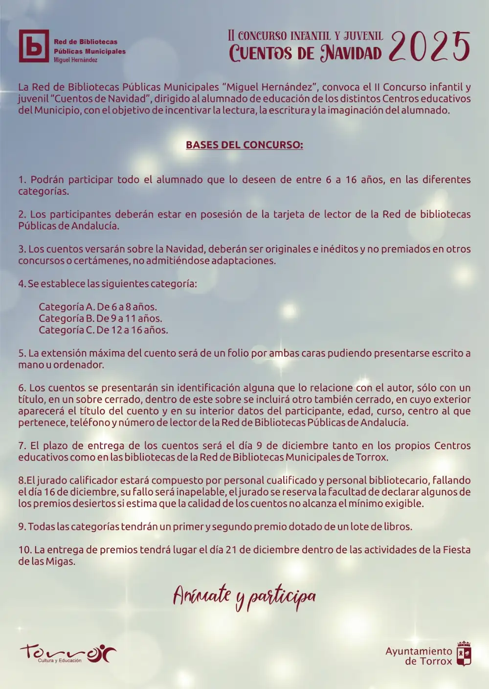 El Ayuntamiento de Torrox ha convocado, desde la Red de Bibliotecas Públicas Miguel Hernández, el II Concurso Infantil y Juvenil ‘Cuentos de Navidad’. Está dirigido al alumnado de los distintos centros educativos del municipio “con el objetivo de incentivar la lectura, la escritura y la imaginación”, ha manifestado el concejal del área, José Luis Ruiz, junto al coordinador de las bibliotecas José Jurado. Todas las categorías contarán con un primer y segundo premio de un lote de libros.