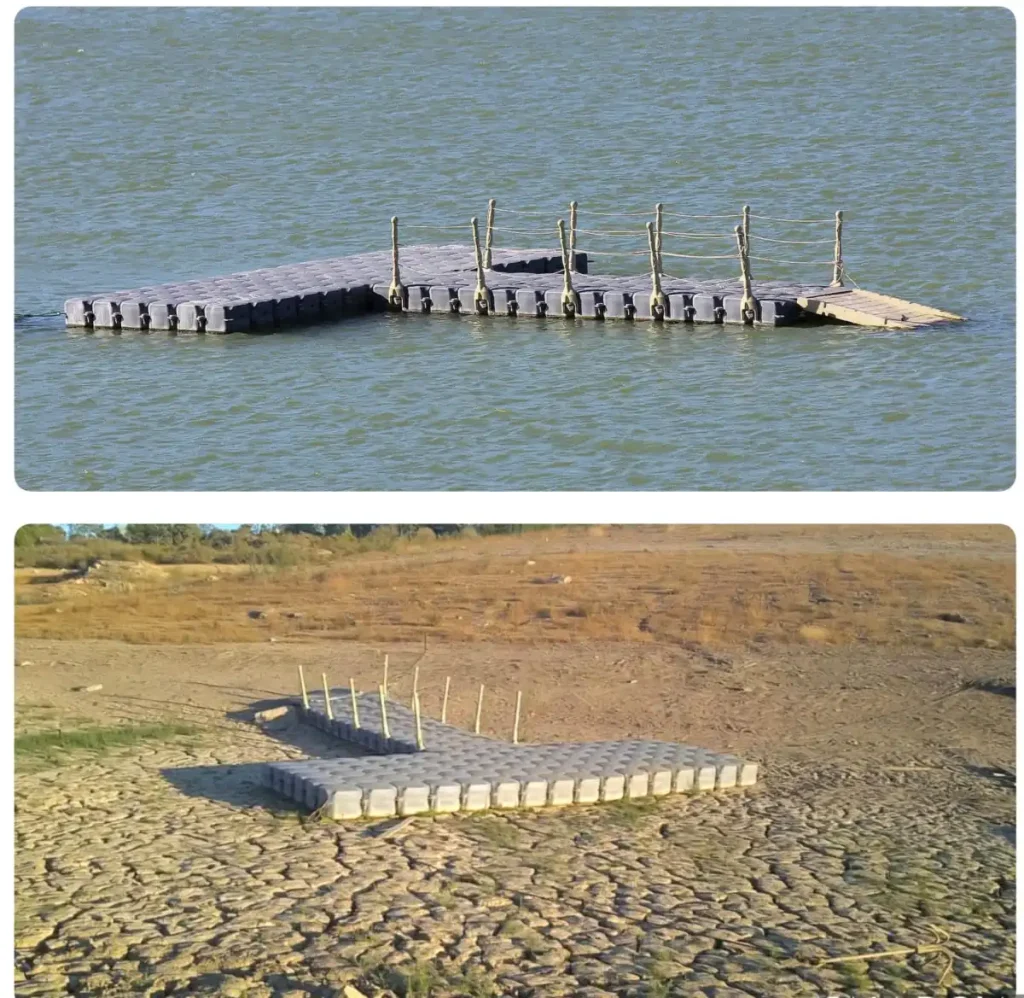 Hoy, tras meses de precipitaciones persistentes asociadas a sucesivas borrascas atlánticas, el paisaje ha cambiado por completo: el agua vuelve a cubrir el antiguo lecho seco, las estructuras flotantes recuperan su funcionalidad y el nivel se acerca a cotas de normalidad hidrológica.