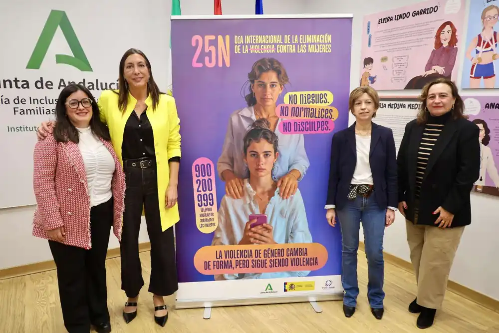 La consejera de Inclusión Social, Juventud, Familias e Igualdad, Loles López, ha presentado esta mañana en la sede del Instituto Andaluz de la Mujer (IAM) la campaña institucional con motivo del Día Internacional de la Eliminación de la Violencia contra las Mujeres, que se conmemora este 25 de noviembre, con el lema ‘No niegues, no normalices, no disculpes’. López ha remarcado que “con esta campaña queremos dejar claro que la violencia de género existe porque negar esta violencia es darle alas, así como visibilizar todas esas formas de violencia que se disfrazan de amor o celos”.