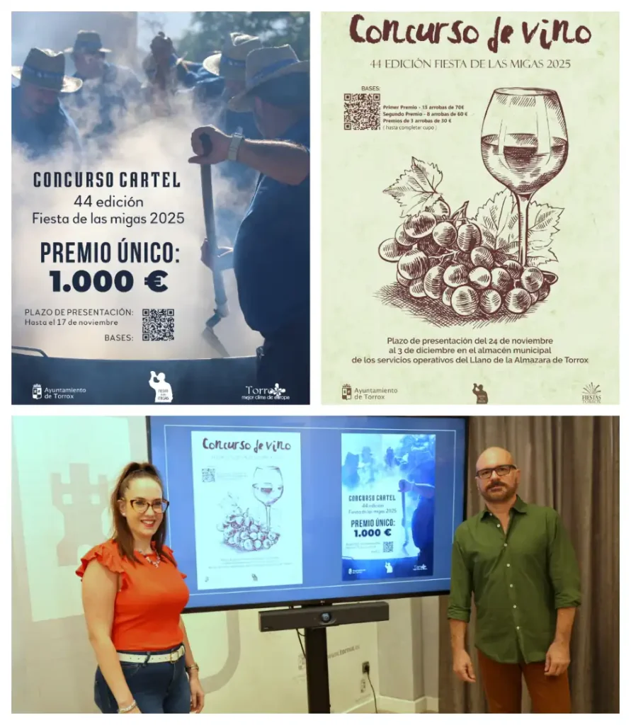 El concejal de Fiestas y Tradiciones Populares del Ayuntamiento de Torrox, Salvador Escudero, y la edil de Presidencia, Mari Ángeles España, han dado a conocer las convocatorias de los concursos para elegir tanto el cartel anunciador de la Fiesta de las Migas 2025 como el de los vinos que se degustarán durante la jornada gastronómica, turística y cultural que se celebrará el domingo antes de Navidad, 21 de diciembre. El concurso del cartel está dotado con un premio de 1.000 euros para el ganador, mientras que el de los vinos repartirá más de 1.600 euros para las 26 arrobas escogidas entre los tres primeros vencedores.
